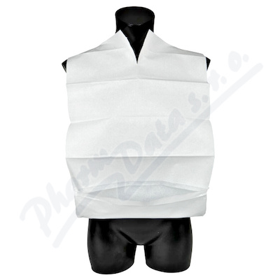 Jednorázové bryndáky, vyrobené z plastové fólie a buničiny. Slouží na ochranu oděvu před znečistěním.