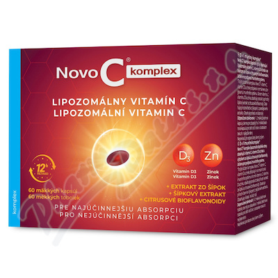 Lipozomální vitamin C Novo C Plus s obsahem šípků a bioflavonoidy ve formě želatinových tobolek s vysokým vstřebáváním od 8 let.