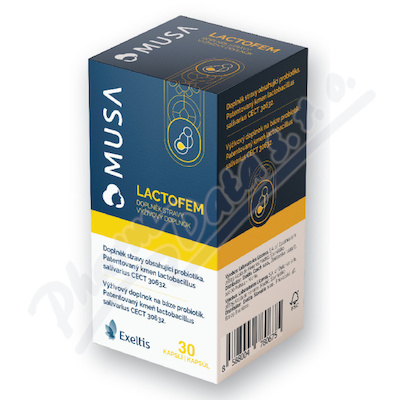 MUSA Lactofem je doplněk stravy obsahující probiotika. Patentovaný kmen Lactobacillus salivarius CECT 30632.