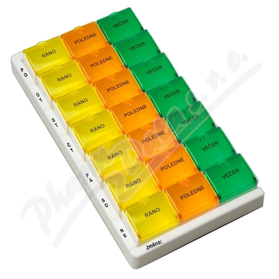 Slouží k přehlednému uspořádání a spolehlivému dávkování léků či potravinových doplňků doma i na cestách. Je označen jednoduchými popisky zobrazujícími denní dobu. Velikost dávkovače 200 x 100 x 25 mm (d x š x v).
