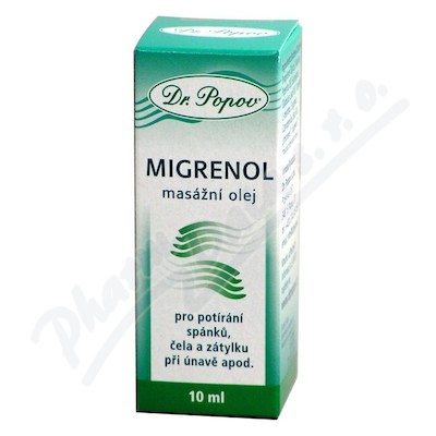 Migrenol masážní olej 10 ml je vhodný k potírání spánků, čela a zátylku při únavě, migréně, nevolnosti a bolestech hlavy. Obsažené přírodní silice, mentol a kafr odstraňují únavu a uvolňují stres.
