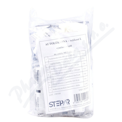 Autolékárnička I., v balení jako náhradní náplň, vybavená všemi potřebami pro první pomoc pro motoristy. Její složení odpovídá vyhlášce č. 153/2023 Sb.